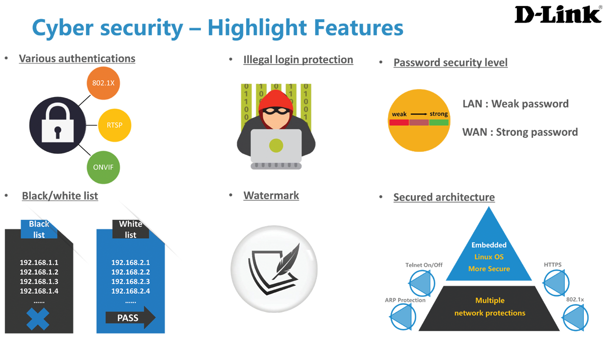 Our weightage is to deliver a high-performance CCTV surveillance system. We intend to meet the customer satisfaction and apply a simple principle- strive to deliver a value for money service, cynosure the technical detail with identifying their needs and requirements so that the customer’s reach his desired specification in Analog and IP CCTV cameras complete range at a single window. D-link products have a variety of security functions and features.